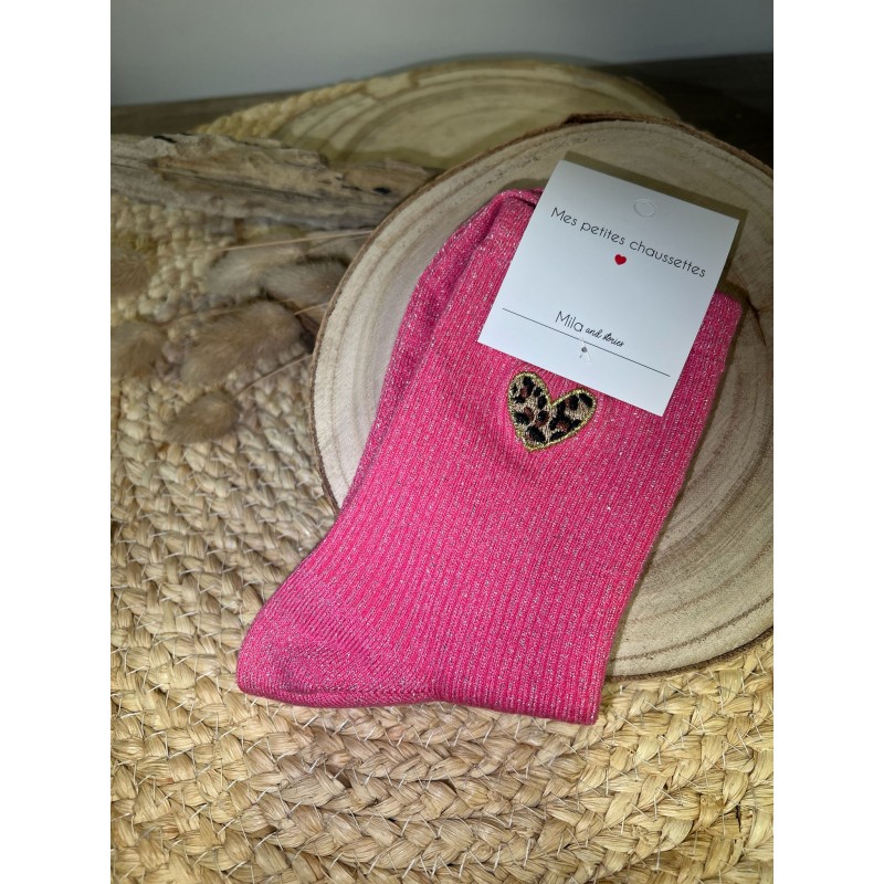 CHAUSSETTES PETITS COEURS LÉOPARD - FUSHIA